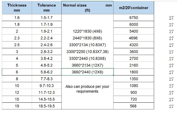 Épaisseur, dimensions standard et quantité estimée par conteneur à titre indicatif